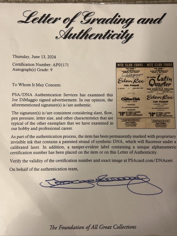 Be the first to review “Joe DiMaggio Autographed Miami Club Advertisement PSA DNA Letter Of Authenticity”
